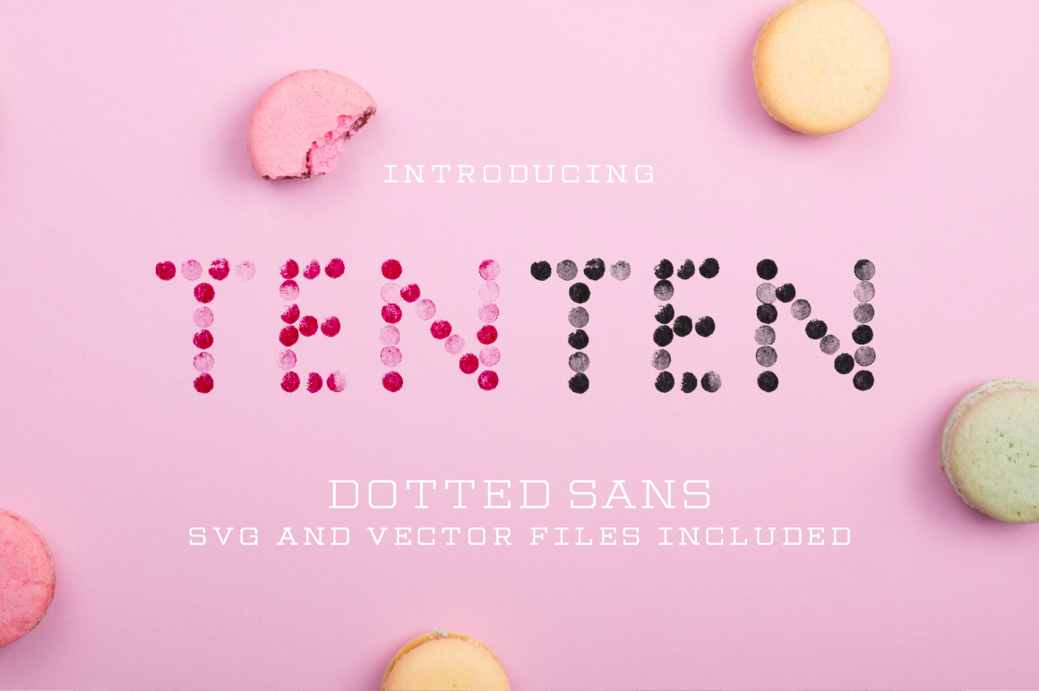 “Ten-ten,” which means “dots” in Japanese, originated as a title font for a magazine project. I used an ink pad and a pencil eraser to create this fun, warm, versatile font.
